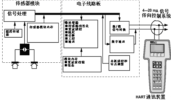 3051 型變送器主要部件為傳感器模塊和電子元件外殼。傳感器模塊包括充油傳感器系統(tǒng)(隔離膜、充油系統(tǒng)和傳感器)以及傳感器電子元件。傳感器電子元件安裝在傳感器模塊內(nèi)并包括一溫度傳感器(電阻式測(cè)試檢測(cè)器)、儲(chǔ)存模塊和電容/數(shù)字信號(hào)轉(zhuǎn)換器(C/D 轉(zhuǎn)換器)。來(lái)自傳感器模塊的電子信號(hào)被傳輸?shù)诫娮釉鈿ぶ械妮敵鲭娮釉k娮釉鈿ぐㄝ敵鲭娮泳€路板(微處理器、儲(chǔ)存模塊、數(shù)字/模擬信號(hào)轉(zhuǎn)換器或 D/A 轉(zhuǎn)換器)、本機(jī)零點(diǎn)及量程按鈕和端子塊。