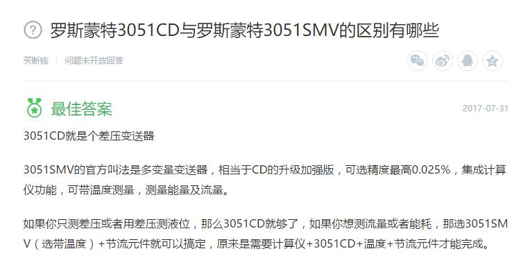 3051CD就是個差壓變送器3051SMV的官方叫法是多變量變送器,相當于CD的升級加強版,可選精度最高0.025%,集成計算儀功能,可帶溫度測量,測量能量及流量。如果你只測差壓或者用差壓測液位,那么3051CD就夠了,如果你想測流量或者能耗,那選3051SMV(選帶溫度)+節流元件就可以搞定,原來是需要計算儀+3051CD+溫度+節流元件才能完成。